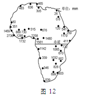 单选题 图12为“非洲大陆年降水量点位分布图”,读图完成问题。