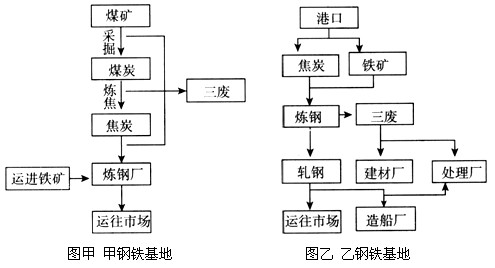 (3)图乙中建材厂临近钢铁基地布局的优点是________________。造船厂的有利区位条件是_______________________。