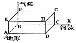 3、单选题 下图中各坐标分别表示气候、地形、河流三种区位因素,箭头指示方向表示区位条件优越性增加。读图完成下列各题。