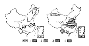 小题1:①主要分布在我国东北地区,可能为大豆,②主要分布在长江流域,为油菜,③分布在黄淮海平原和新疆,为棉花,④分布在热带和亚热带地区,为甘蔗。所以本题选择D选项。