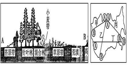 小题2:根据图示丁表示的是从沿海向内陆的地域分异,甲、乙、丙表示的都是从赤道向两极的地域分异,但能体现左图中荒漠、草原带的只有乙。