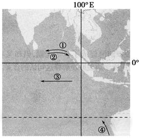 【小题1】从经纬度位置及海陆轮廓可以判断出,该区域为印度洋海区。由题干可知,①和②是季风洋流。受冬季东北季风的影响,北印度洋1月洋流流向是逆时针方向,因此①表示1月(冬季)时的洋流;受夏季西南季风的影响,北印度洋7月洋流流向是顺时针方向,因此②表示7月(夏季)时的洋流;③是南赤道暖流,是受东南信风的影响而形成的,常年存在。