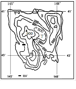 (1)若要在岛上从甲地到乙地修建铁路。根据你学过的知识设计一条较合理的线路。用图例“”画在图上。(2分)