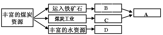 (1)将下列选项的字母填在图中相应空格内,使其正确表示出德国鲁尔区五大工业部门间的联系。(2分)