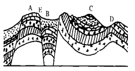 (1)图中A、B、C、D、E五处,从地质构造看,属背斜的是______________,向斜的是____________________________。