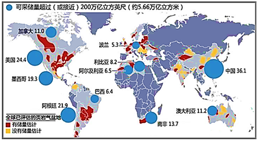 4、单选题 页岩气是蕴藏于页岩层可供开采的天然气资源,水力压裂法是目前开采天然气的主要形式,要求用大量掺入化学物质的水灌入页岩层进行液压碎裂以释放天然气。读图“全球页岩气盆地及储量最多的11个国家”,回答各题。