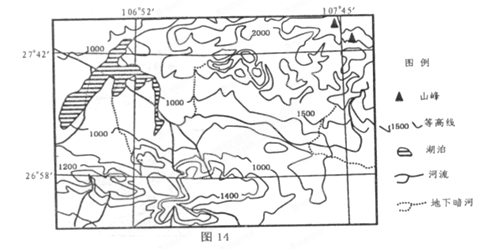 本题解析:(1)地形特征应指出该地区的主要地形类型和地势分布特征。结合该地区的经纬度和等高线分布,判断该地区位于我国云贵高原地区,以山地、高原地形为主,地势基本呈西南、东北高,中间低,地形起伏较大。(2)结合上题分析,该地区位于云贵高原,其地下暗河发育反映喀斯特地貌,主要从其岩石的类型和流水作用的角度分析。