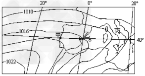 4、单选题 下图为世界某一区域,图中曲线为某季节等压线分布状况,回答1-3题。