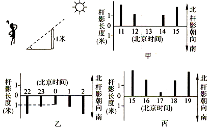 【小题1】从图中影子的变化来看,一年中大多数时候影子朝北,而且影子较短,,有一小段时间影子朝南,那只能是在北回归线到赤道之间了,并且一年有两次太阳直射,影子为零,所以C.D.选项不符合,A选项也不合适,只有B选项最符合题意。故选“B.2 5