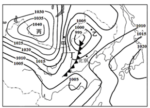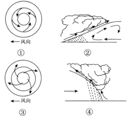 (2)丁地的天气系统名称是________,受其影响过境时的天气状况是 ,右中能反映该天气系统的示意图是________(填序号)。