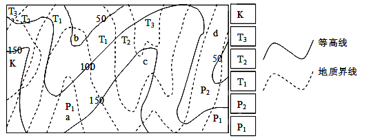 4、单选题  读某地等高线地形图与地质分布图,K—P1代表岩层由新到老。读图完成下列问题。