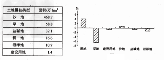 2、单选题 表为我国图某区域1999 年主要土地覆被类型的面积。图示意该区域1999 ~2007 年土地覆被类型面积变化率,正值表示增长,负值表示养活,该区域生态环境已呈退化趋势。据此完成1 ~2题。