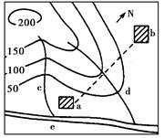 本题解析:本题考查等高线的综合分析。A项根据指向标,a村在b村的正南方向;错误。B项d处等高线“凸低为高”,为山脊,不可能有河流;错误;C项e处位于河流上游,建造纸厂,水污染严重;错误。D项a村到b村之间穿过山脊,故建公路应避开陡坡,沿等高线延伸。正确