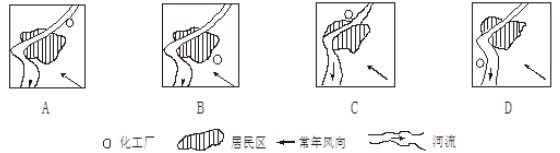 本题解析:工业区应位于河流的下游,盛行风的下风向或盛行风的垂直郊外,所以选D。 点评:本题难度较小,解答本题需明确:化工厂生产有大气污染和水污染,应布局于河流下游,盛行风向的下风向或垂直郊外,故D项正确。 【方法技巧】城市功能区的合理布局 1.从风向要素考虑工矿企业的合理布局 对大气有污染(有害气体和烟尘等)的工矿企业(如石油化工厂、钢铁厂、火力发电厂等)应布局在主导风向下风向的郊区。如果当地为一个主导风向,应置于主导风向的下风地带,如果当地为季风区,则应布局在与冬夏季风风向垂直的郊外。 2.从河流流向角度考虑工矿企业的合理布局 对水体污染较严重的工矿企业(如印染厂、农药厂、化肥厂等应布局在远离水源地和生活用水取水口的下游河段。 3.从环境综合效益的角度考虑居民区的合理布局 居民点可以和无污染、规模小,但劳动力要求多的工厂企业交错分布(如电子装配企业、家具制造厂等),对环境有轻度污染的工矿企业应当与居民点有一定的距离,对环境有严重污染的工矿企业应远离居民区,并营造卫生防护带加以隔离。如下图所示: