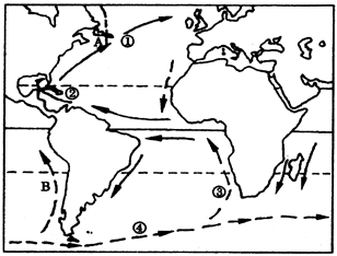 (2)图中①②③④四支洋流中,是被盛行风吹拂而形成的是______________该盛行风为______________。