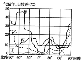 【小题2】由上题可知,丙曲线为丙为陆地上气温日较差,南北纬30°地区受副热带高带控制,多晴朗天气,白天对太阳辐射削弱小,气温高;夜晚大气逆辐射弱,对地面保温作用弱,气温低,故气温日较差大。