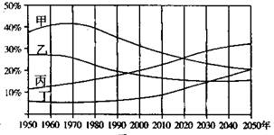 1.此题考查读图分析能力,比较发达国家与发展中国家少年儿童人口系数与老龄人口系数,解决此类试题需掌握发达国家与发展中国家人口年龄结构的差异,并注意区别比较。图中四条曲线代表发达国家与发展中国家的少年儿童人口系数(0?15岁少年儿 童占总人口的比例)和老龄人口系数(60岁以上老人占总人口数的比例)变化曲线。从图中我们可以区别出1950年发展中国家少年儿童比重最大,且在1970年以后呈下降趋势,1950年发达国家少年儿童比重大于发达国家老年人口比重,且少年儿童人口系数1970年后呈下降趋势,而发达国家老年人口系数呈上升趋势,而1950年发展中国家老年人口系数比重最低,且呈上升趋势。故甲曲线代表发展中国家少年儿童人口系数,乙曲线代表发达国家少年儿童人口系数的是,丙曲线是发达国家老年人口系数,丁曲线代表发展中国家老年人口系数。
