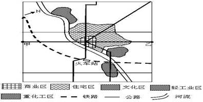 根据图中的指向标、轻工业区和重化工业区的位置可以判断出该城市主导风向为西风,河流的大致流向是自西向东。