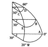 本题解析:(1)根据经度的分布可知A在20?W以东30?处的经度是10°E;越向北,纬度越高,所以是北半球。(2)地球自转线速度随纬度的增加而递减。(3)经度变化15?,时间相差1小时。(4)本题根据经纬度判断方位。