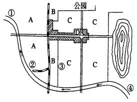 参考答案:(1)商业区——D;工业区——A;居住区——C;绿地——B