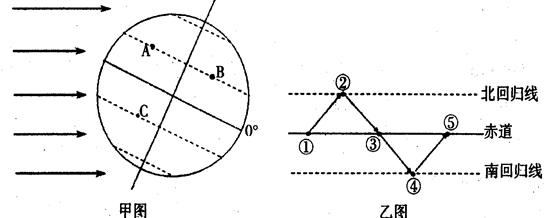 (4)这一天,太阳直射点在乙图①②③④⑤中 的位置上;该日以后,太阳直射点向 (方向)移动。