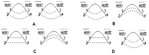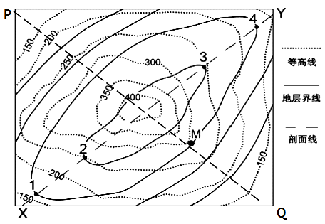 5、单选题 下图为某向斜山地形地质示意图。读图,沿XY线与PQ线的剖面图组合正确的是( )