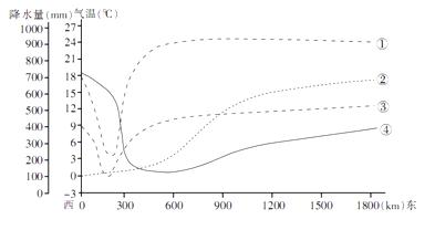B.12日温差大的原因是乙较强,丁较弱 C.9日温差小的原因是甲较强,乙较弱 D.9日温差小的原因是甲较强,丙较弱 参考答案: 本题解析: 本题难度:一般 4、单选题 下图为沿某大陆34°纬线所做的气候要素变化曲线图(①表示1月均温,②表示11~4月降水量,③表示7月均温,④表示5~10月降水量)。读图,完成下列各题。 |