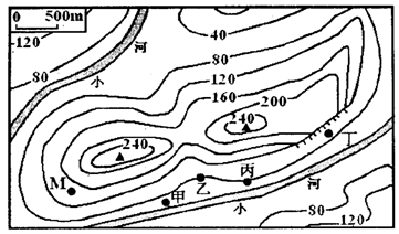 (1)根据图中等高线的分布情况判断,选择丙地宿营较为合适。理由有:①夏季易发洪水,甲地离河边太近,有危险;乙地处于谷口,是暂时性洪流必经之地,有危险;丁地处于陡崖之下,可能有落石或崩塌,有危险②丙地避开了山谷、河边和陡崖,相对两侧地势较高,到河边距离适中,相对安全。