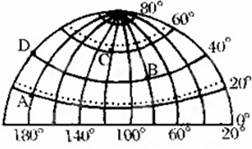 (2)根据示意图,经度每隔相差20°,B的坐标为(40°N,80°W),B点和其对称点经度和为180°,纬度相同,南北纬相反,该点为(40°S,100°E)