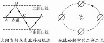 (1)将左图中的A、B、C、D标在右图适当的位置,并注出两至日。