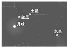 4、单选题 该图为2009年10月16日黎明时分出现的水星、金星、土星“三星伴月图”,据此回答问题。