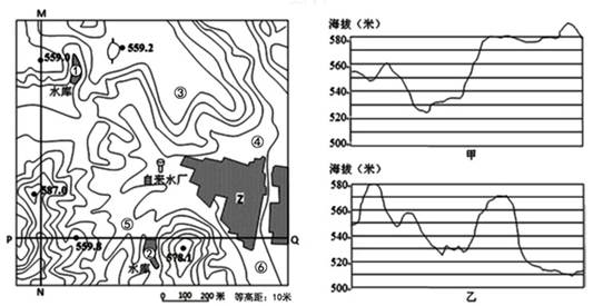 1.读图,可以看到,MN剖面线在M点海拔约560米,在N点约580米,中间经过的最低点海拔低于530米,所以甲是MN剖面线。同理判断出乙是PQ剖面线。①水库到自来水厂之间等高线密集,坡度较陡,工程费用大,且有些地段地势升高,不易做到自流引水,②水库到水厂之间坡度平缓,且之间没有高地,容易实现自流引水,所以应选择②水库。选项C对。A、B、D错。