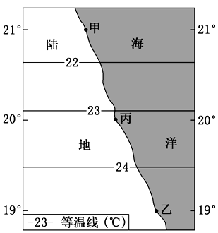 5、单选题 气温的日变化一般表现为最高值出现在14时左右,最低值出现在日出前后。下图示意某区域某日某时刻的等温线分布,该日丙地的正午太阳高度达一年中最大值。读图回答下面各小题。