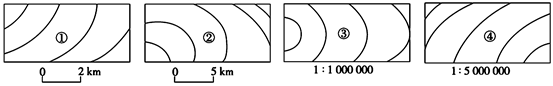 【小题1】图幅相等,比例尺越大,表示的实际范围越小,表示的地理事物越详尽;比例尺越小,表示的实际范围越大,表示的地理事物越粗略,四幅图中,④图比例尺最小。