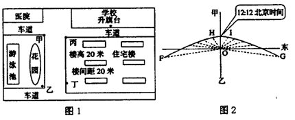 材料?青云花园是我国某城市(36034’N)一所集欧美建筑精华于一体的住宅小区,小区设施齐全,环境优美,豪华典雅。完工后当地居民争相购买,然而一年后底层住户以采光条件差为由将开发商告上法庭。下面图1为“青云花园小区分布平面图”,图2为该小区学校研究性学习小组绘制的“某一日内旗杆杆影轨迹示意图”? (0为立杆处,虚线为杆影,曲线为杆影端点轨迹)。tan300≈0.577。