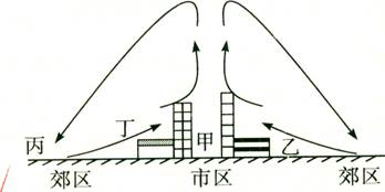小题2:城市热岛,由于市区温度高,气流上升,气压低,而郊区相比,气温低,气流下沉,气压高,形成城市热力环流——城市风,为了较少大气污染,化工查因布局在热力环流的半径范围外,才不会使得污染物因城市风进入城市,故该布局在丙。