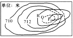 小题3:等高线向高处凸出的地方为山谷,是雨水的汇集处。丙处位于山谷处,当下大雨时,雨水会沿下图中箭头方向流动,该空瓶最有可能随雨水漂移到丁地,故答案选A。