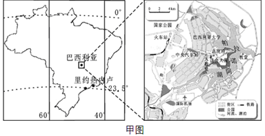 5、综合题 (15分)读图甲为巴西简图和巴西利亚城市的平面示意图,图乙为我国东部沿海某地区城市分布图,回答下列问题: