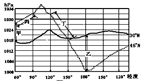 5、单选题 图是2010年某月份海平面平均气压沿30°N、48°N两条纬线的变化图,回答下列各题。1.该月份,下列地理现象不可信的是2.当处于图反映的季节时,下图中盛行西北风且处于多雨季节的是