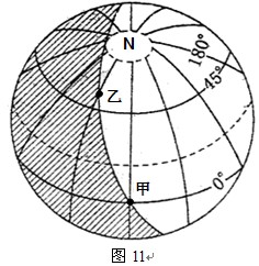 【小题2】图中甲乙两地均位于晨昏线中的 线上,乙地昼长是 小时。