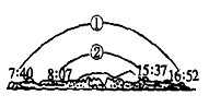 5、单选题 下图为我国①,②两地某日日出日(北京时间)示意图,读后完成下列各题。