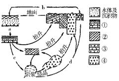 【小题4】图中所示的水循环类型为 循环,在该类水循环参与下,①处的 岩可转化为②处的 岩,②处的岩石具有 结构。