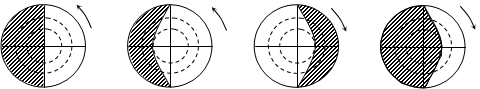 5、单选题 下列四幅图中(空白部分表示白昼,斜线部分表示黑夜,小圆圈表示极圈),太阳直射点纬度位置大致相同的是