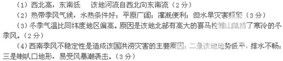 参考答案:(1)弊:降水有明显季节变化,水位季节变化大(2分);沿岸多悬崖、瀑布(2分),不利于航行。利:无结冰期,通航时间长;(2分)(或且注入赞比西河,有利于提高其联运能力)。