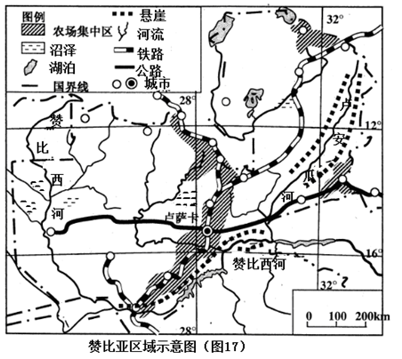 (3)结合图示,该国的农场大多分布于铁路和公路沿线;该国实施大规模商品化生产困难的社会经济条件从市场、交通、科技、农业基础等方面分析。