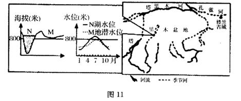 N为塔里木盆地的内陆湖,M为湖边的小绿洲,N湖泊的主要补给水源与M绿洲盐碱化最严重的季节是?