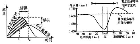 3、单选题 水库具有多种功能,如防洪、发电、灌溉、养殖等,并且能改善局部地区的气候。下图左是某水库洪水时径流调节示意图,下图右是某水库蓄水前后对库区周围地区降水量的影响示意图。读图回答下列题。