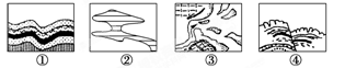 【小题1】根据图示的岩层分布和地貌景观判断,①图岩层发生弯曲,故判断为褶皱;②图示为风蚀蘑菇,属于风力侵蚀作用形成的地貌;③图为河口三角洲,为流水沉积作用形成的地貌;④图岩层发生断裂,为断层构造。