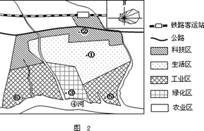 2、单选题 图2是我国南方平原地区某城市功能分区图。读图,完成: