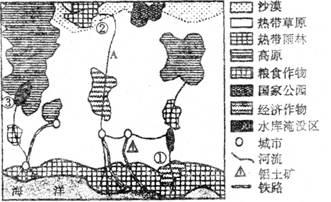 2、综合题 图中地点①有200万农民生活在热带雨林区,该流域的森林覆盖率高。地点②有几片绿州和软场,约有170万人从事种植业和畜牧业。地点③没有村庄,无人居住,下游地区有大量种植粮食作物的农民。该国发现铝土矿后,计划发展炼铭工业。近年来,该区域的沙漠有逐渐南扩的趋势。据材料信息与下图,回答下列问题。(11分)